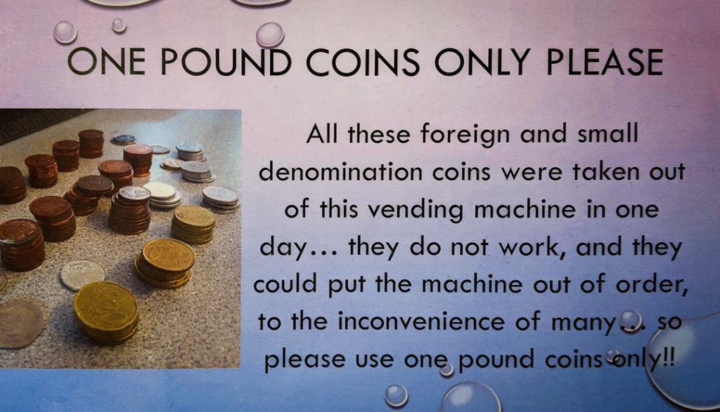 A while ago I noticed this sign on a vending machine in our local arts centre. It could have simply reminded people to use: “One Pound Coins Only Please”. But the sign maker took it one step further and decided to add a bit of context.