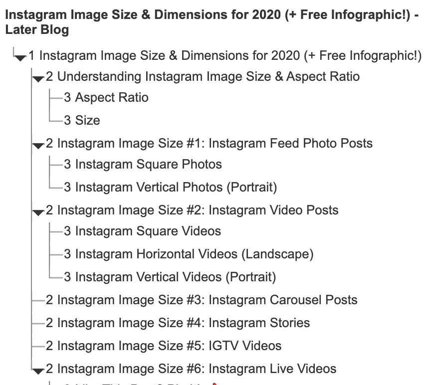 The heading map of Later.com’s Instagram image size guide: comprehensive, if a bit repetitive.