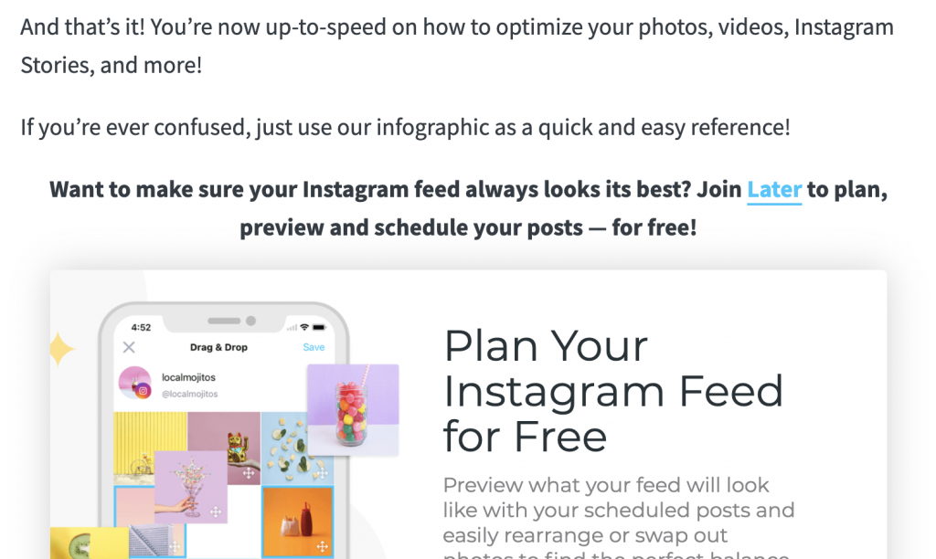 By the time the reader gets to this line, chances are, they’re already so endeared to the Later.com brand for generously sharing all of this helpful advice, that they don’t mind being sold to. In fact, it feels useful just like the rest of the article.